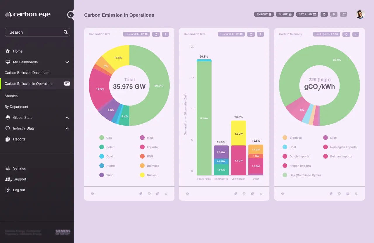 The requirement was to design a dashboard that would assist any type of organization in their efforts to reduce their CO2 emissions to meet industry standards, comply with government mandates, or fulfill internal corporate social responsibility standards.