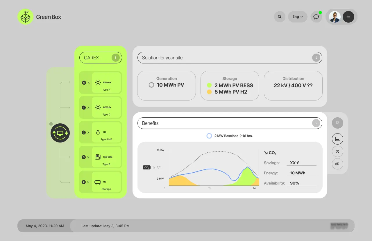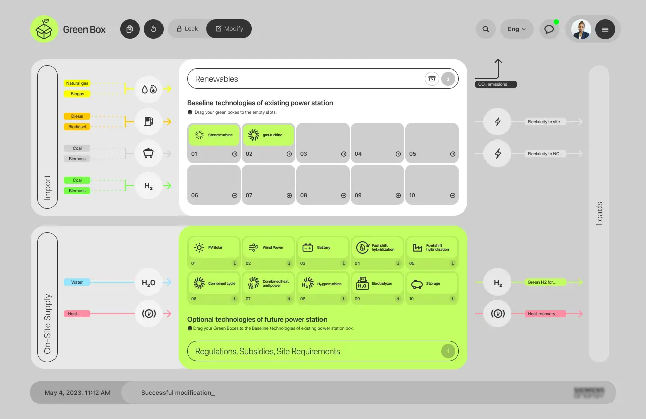 Input loading such as energy demand, business objective to be met, and assigned budget, among others. The preconfiguration option calculates an ideal configuration that can then be modified.